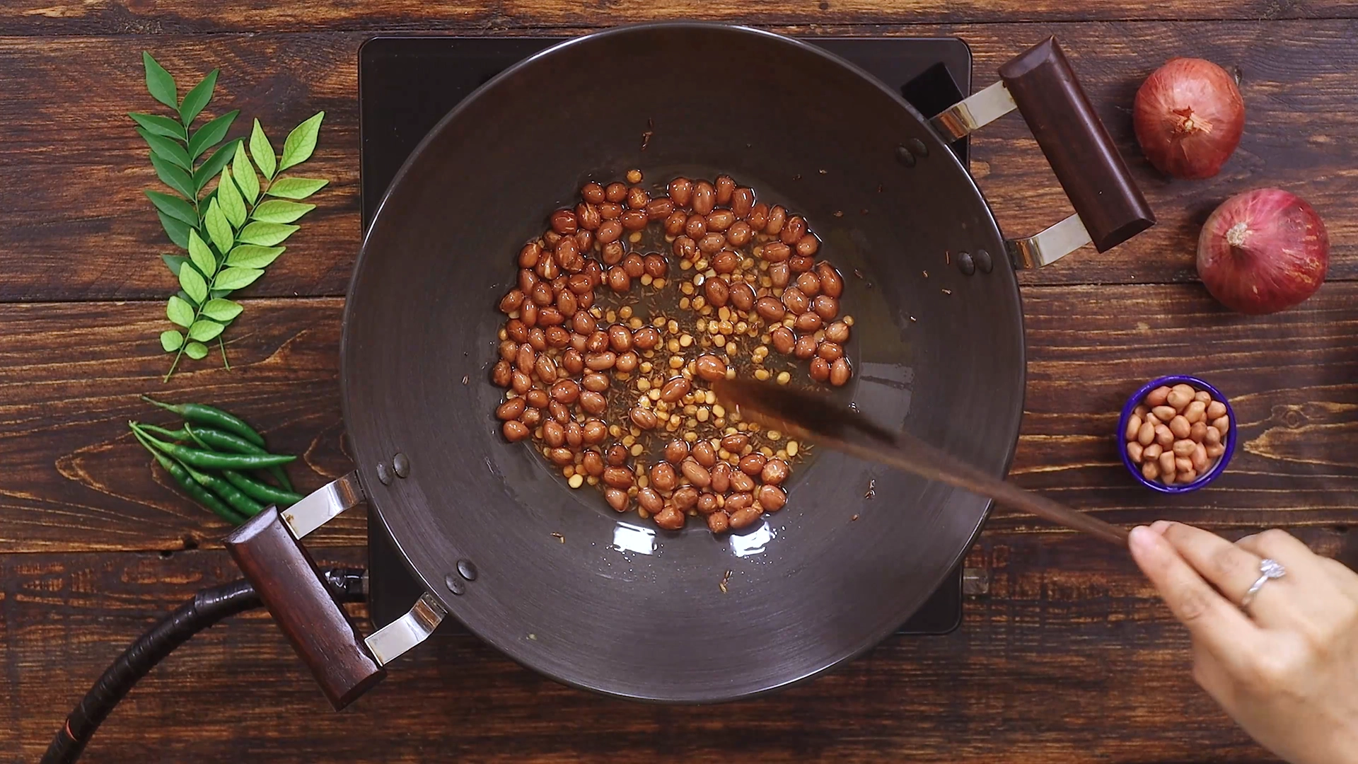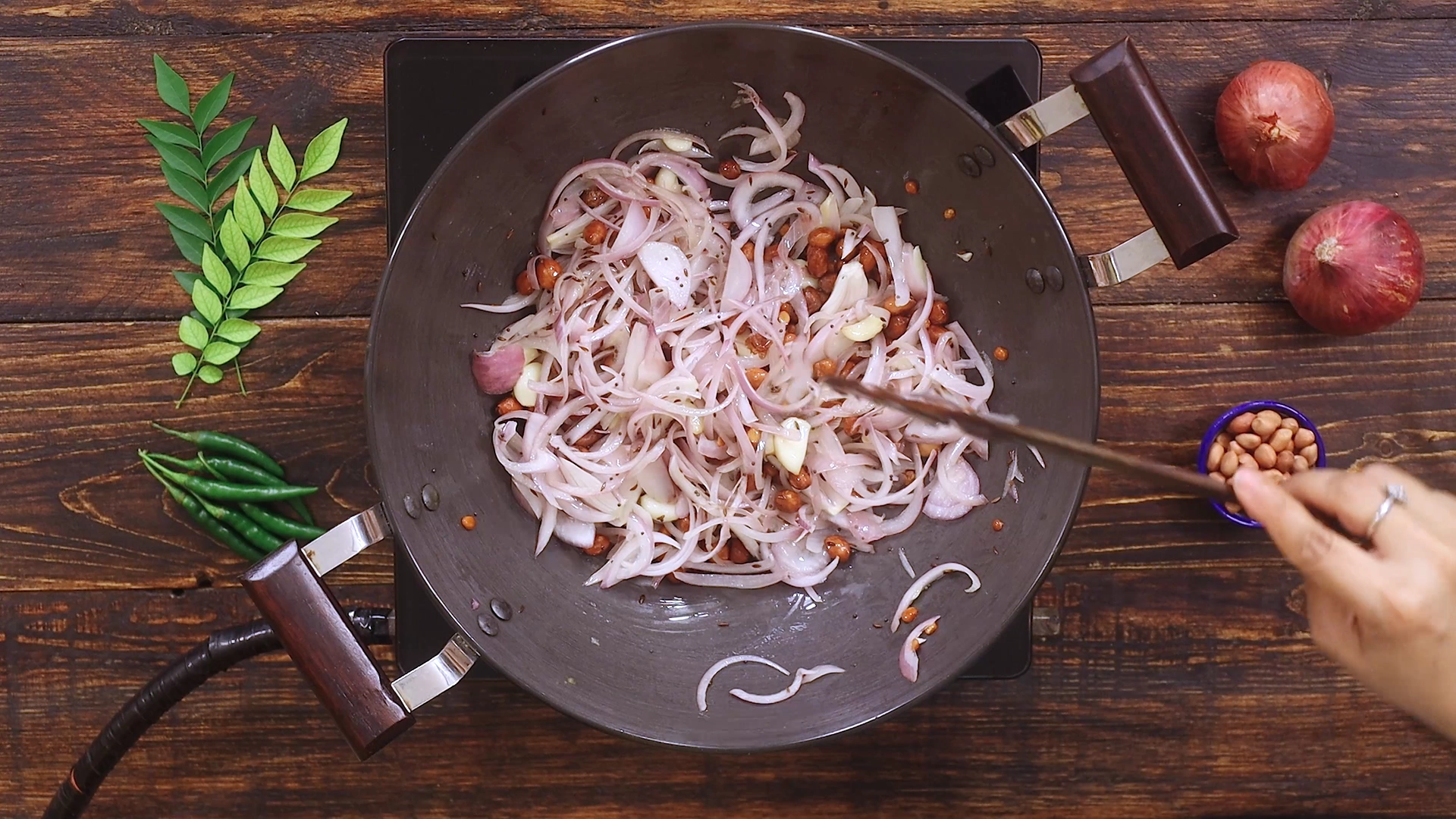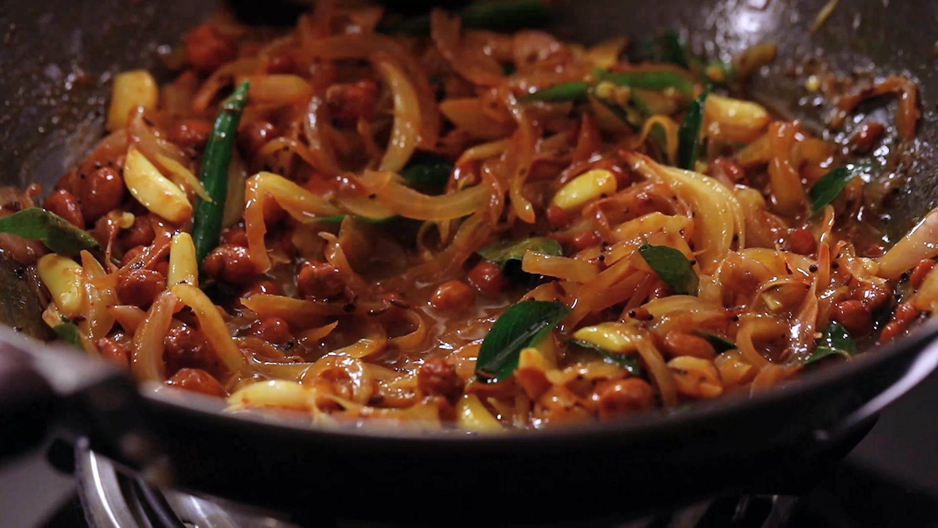 First, heat oil in a wide pan. Toss in chana dal, mustard, and cumin seeds, plus a handful of peanuts, and sauté until golden and nutty. Next, toss in a whole bulb of garlic cloves—let them sizzle until fragrant, then add thinly sliced onions, cooking until they turn translucent and slightly caramelized.