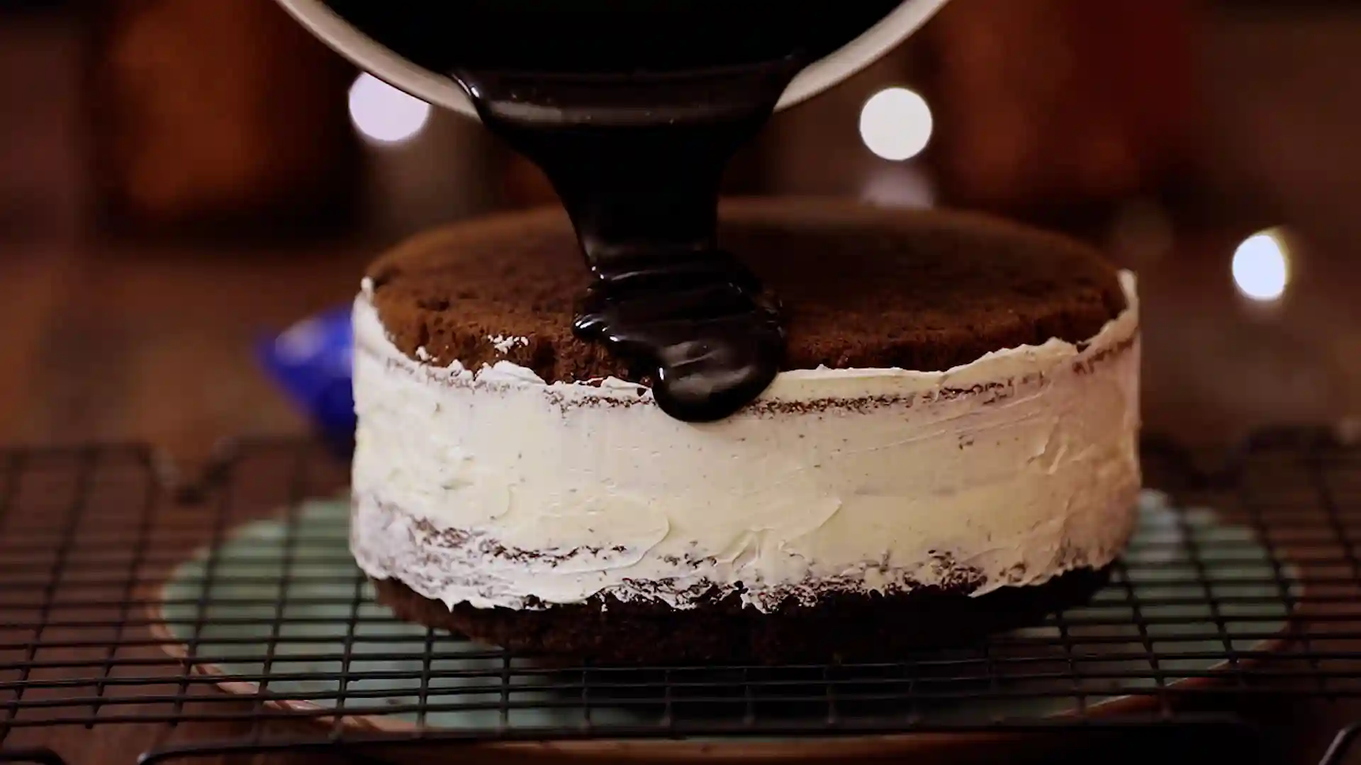 Pour ganache over the top of the cake -