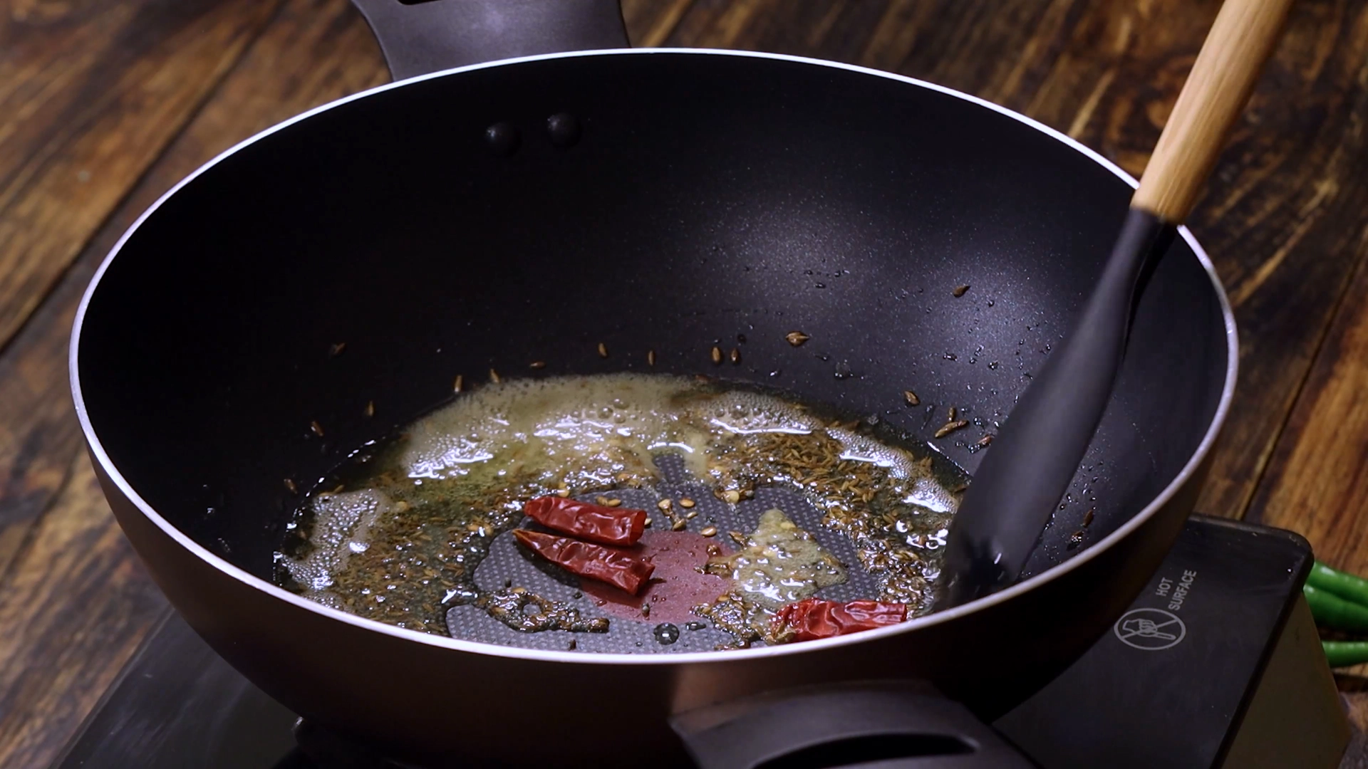 Heat a mix of ghee and oil in a kadai. When the mustard and cumin seeds crackle, add your red chillies and hing — this alone will give your kitchen that iconic “tadka aroma.”