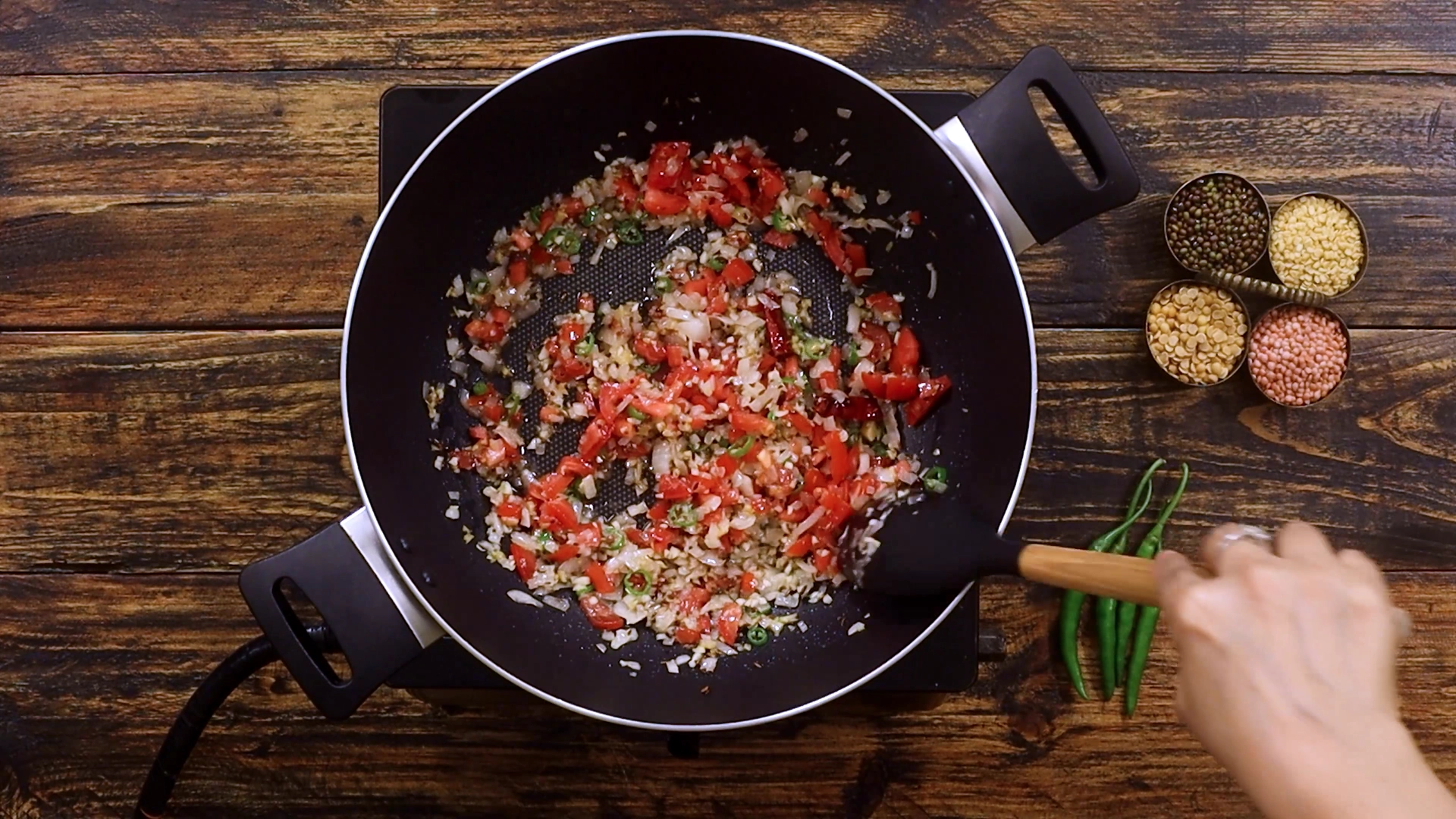 Next, you’ll sauté garlic, ginger, green chillies, and onions until they turn lightly golden. Once tomatoes go in, you’ll see the masala thicken and turn glossy — that’s when you know it’s ready to meet the dal.