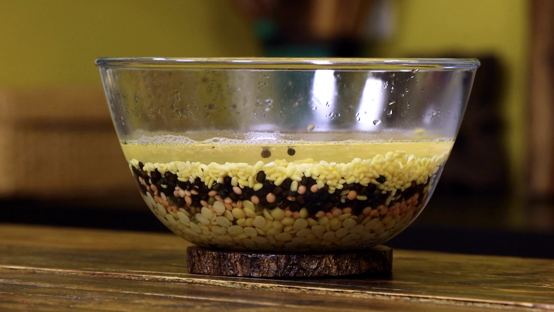 You’ll start by soaking all five dals together — this not only cuts down cooking time but also helps them cook evenly into a creamy, unified texture. Once soaked, pressure cook them with turmeric, salt, and a little oil until soft and mushy.