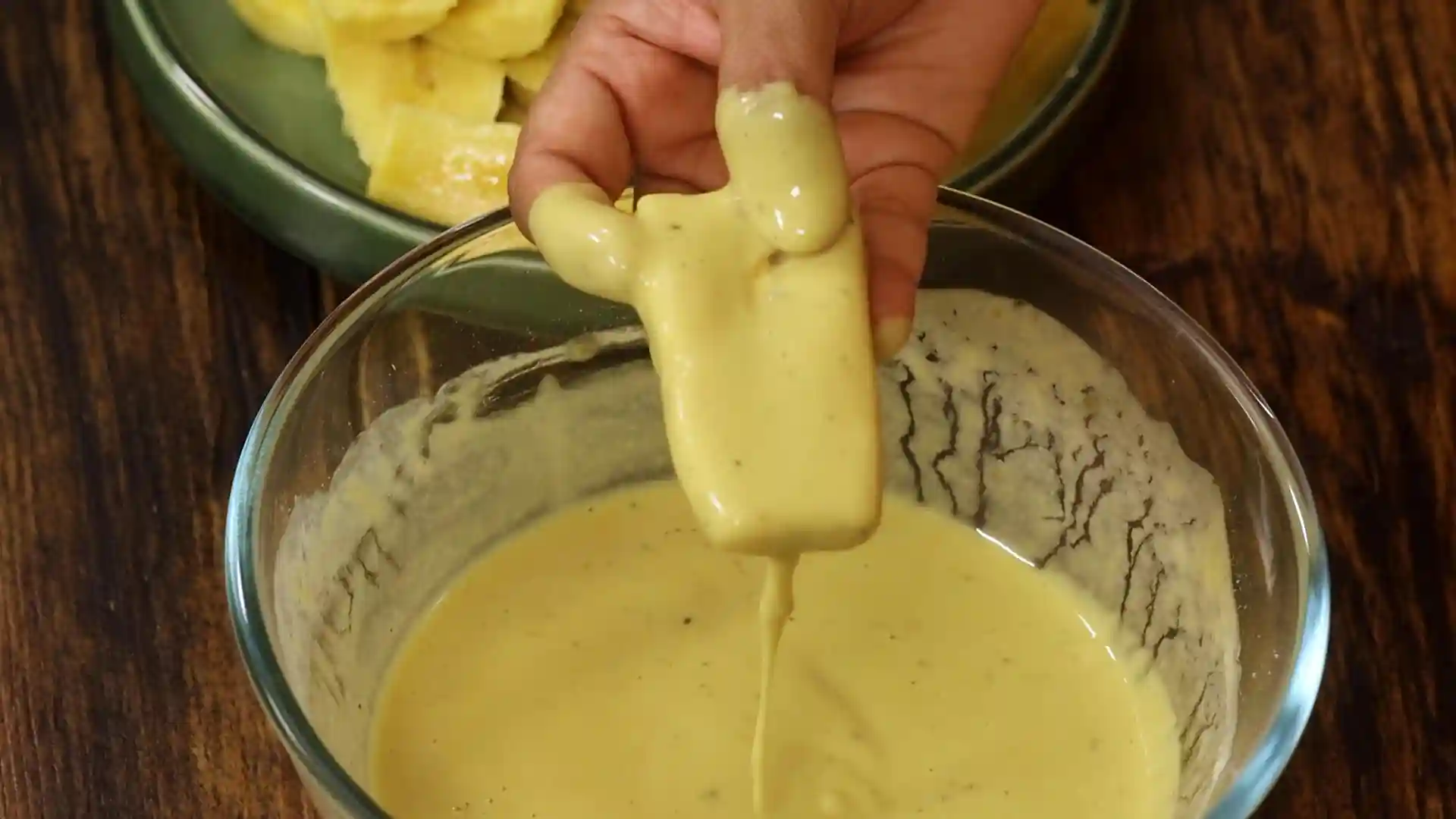 Dip banana slices into the batter, coating them evenly -