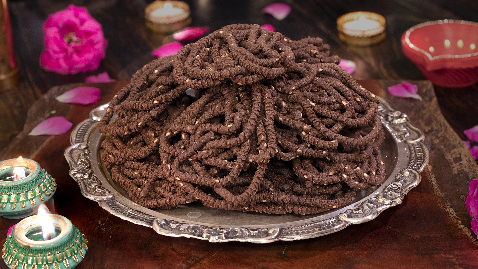 Murukku (aka chakli) is a traditional South Indian crisp made with flours and aromatic seasonings.