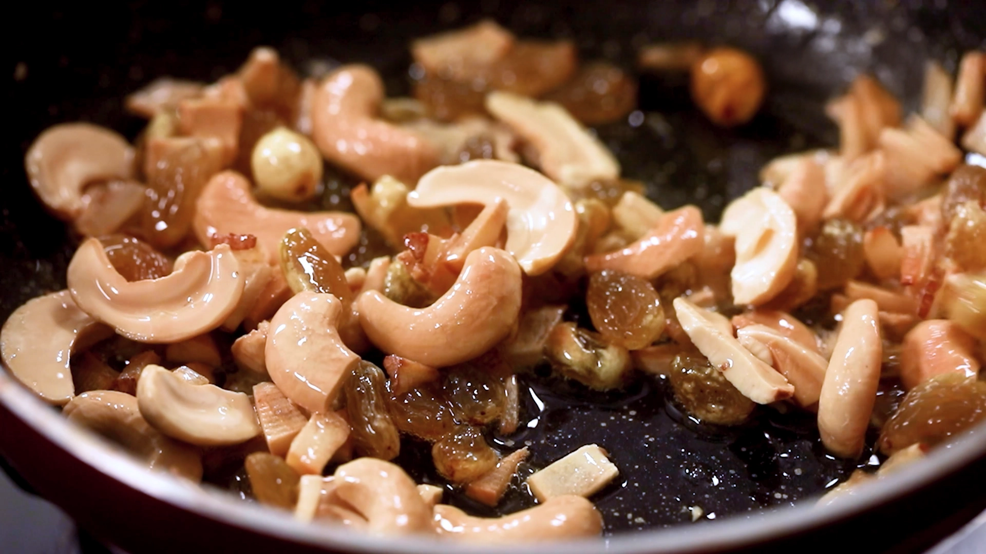 Heat ghee in a small pan and roast cashews, coconut bits and raisins until golden; set aside -
