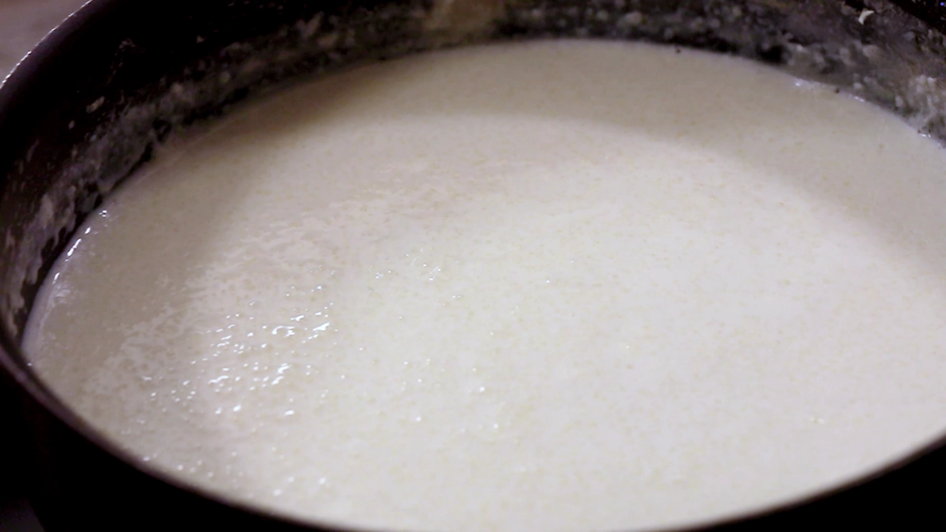 Add the hot boiled milk to the softened rice and cook on medium-low, stirring occasionally -