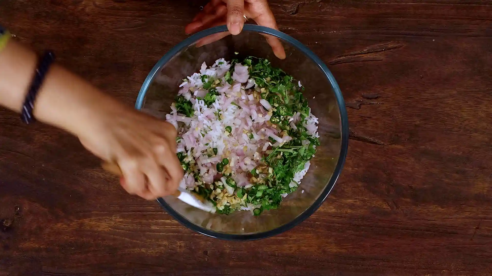 You start by placing your leftover rice in a wide bowl and gently breaking it up—no mashing into paste. Then you mix in finely chopped onion, ginger, garlic, curry leaves, and coriander. At this stage, your kitchen already smells promising.