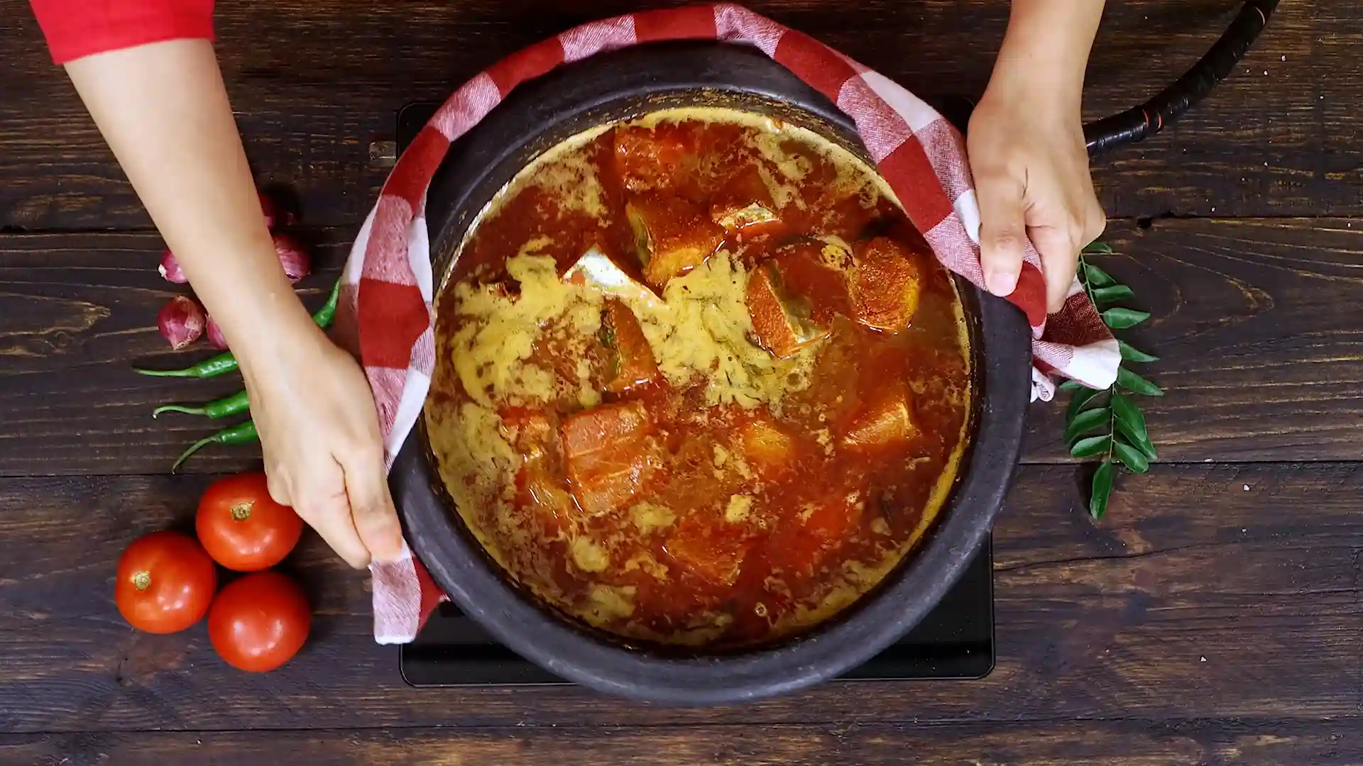 And here’s the key part, no stirring with ladles. Just gently swirl the pot so the fish doesn’t break. Ten minutes on medium-low heat later, the oil starts floating on top and you know the curry is ready.
