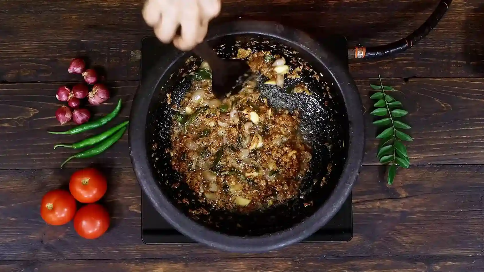 Tomatoes add body, tamarind adds punch. Together, they create that thick, glossy gravy that coats rice perfectly.