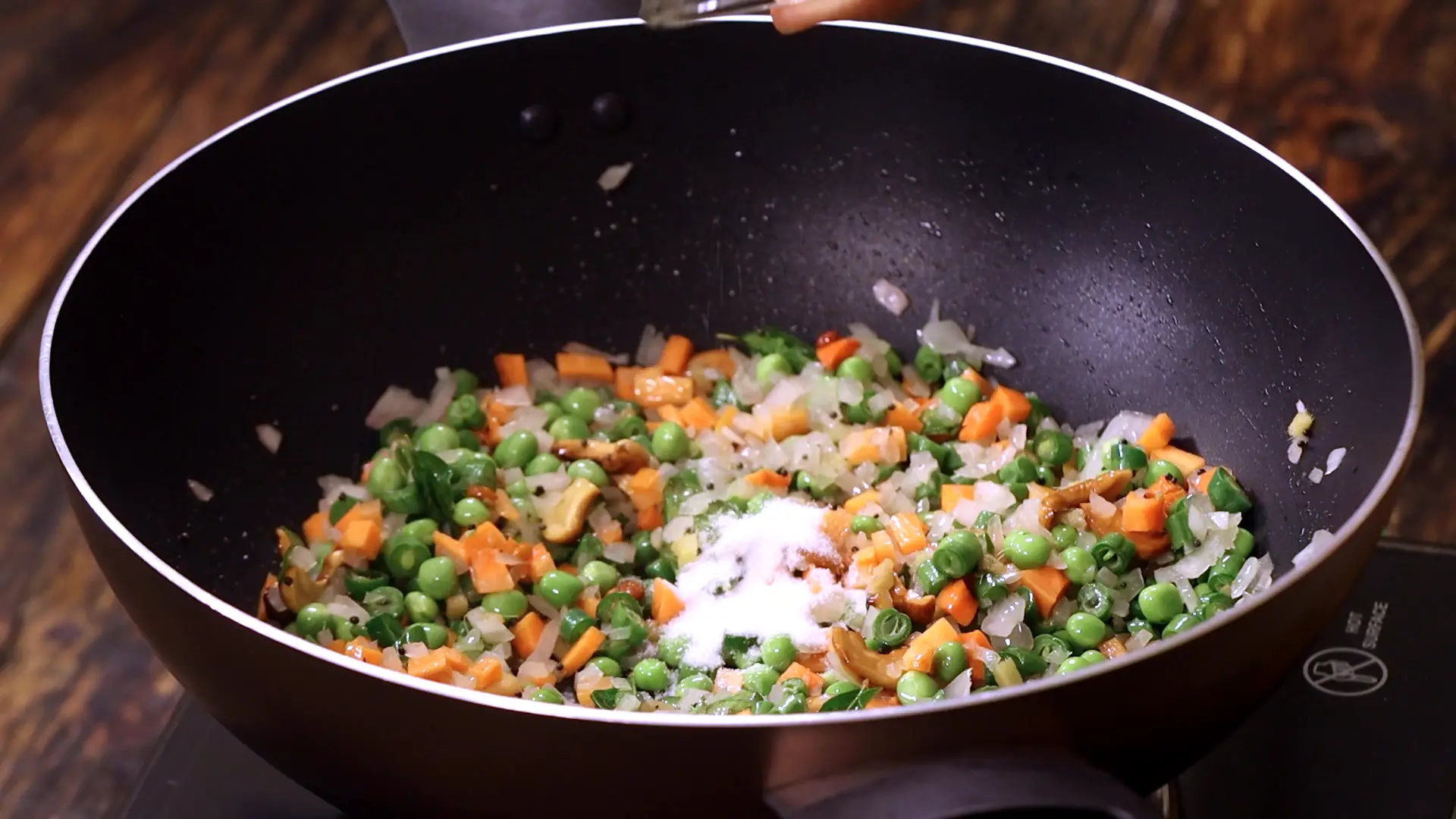 Add the chopped carrot, beans and green peas; mix well and add salt, stirring to combine.