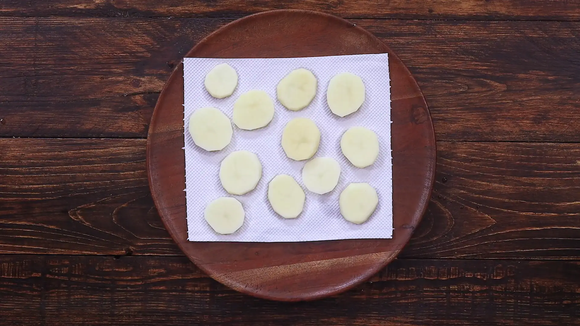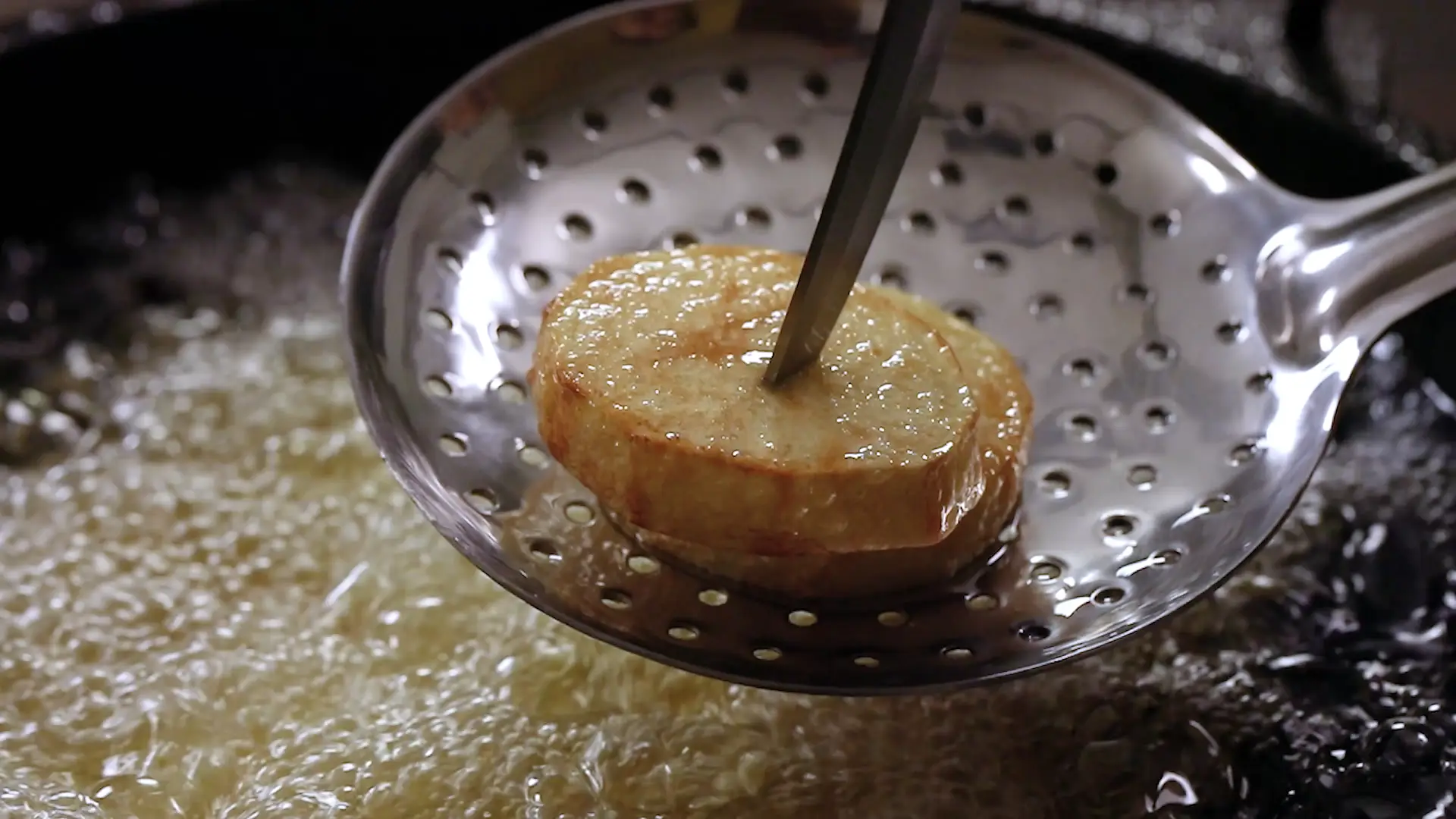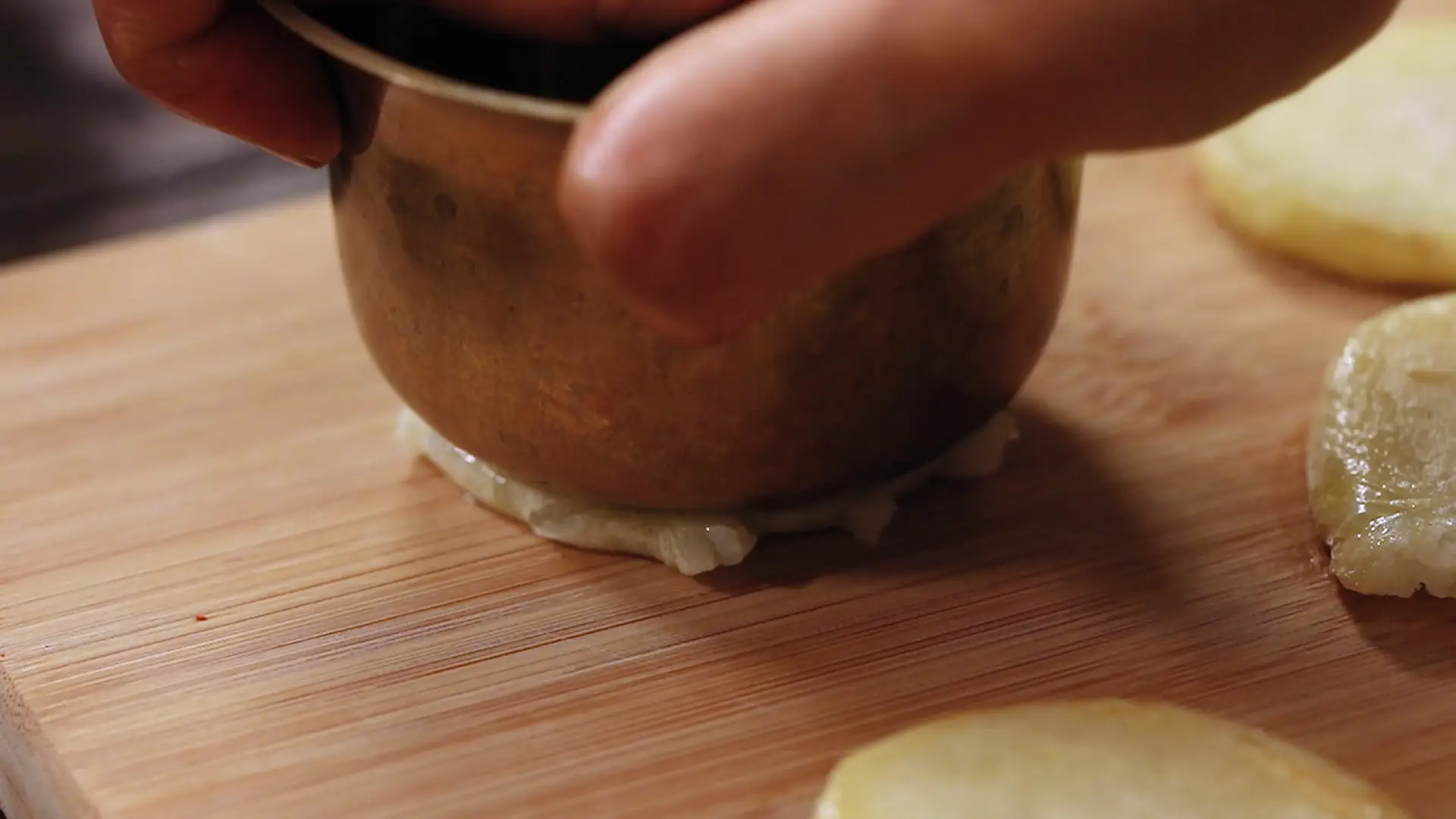 First, slice the potatoes about 1 cm thick and soak in salted water to draw out excess starch. After drying each slice well, deep‑fry them until just cooked through—you’ll see steam escape when pierced. Remove and let them rest so the interior sets.