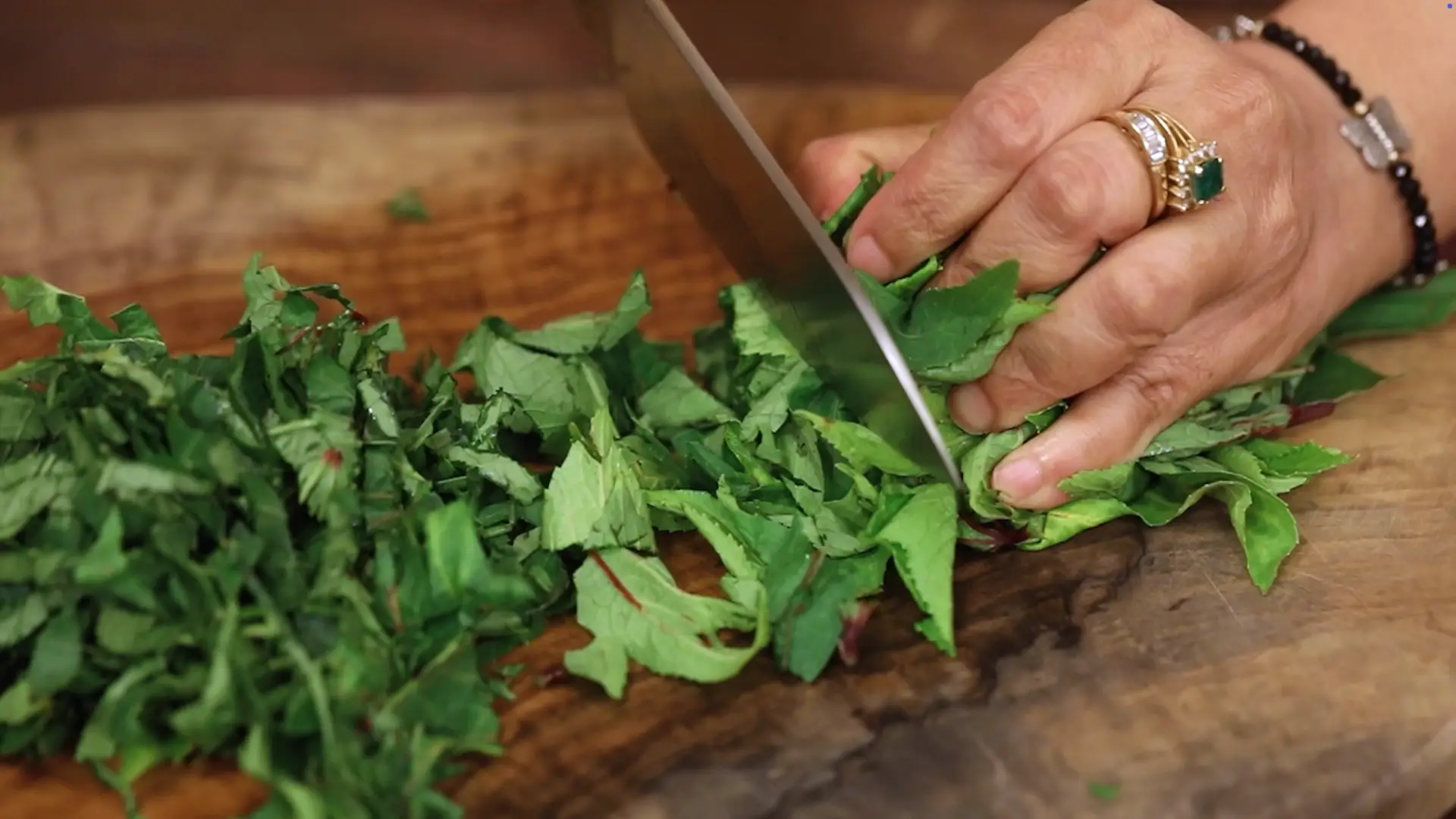 Add the washed, chopped sorrel leaves and fry until the leaves turn soft and mushy and the tanginess comes out. -