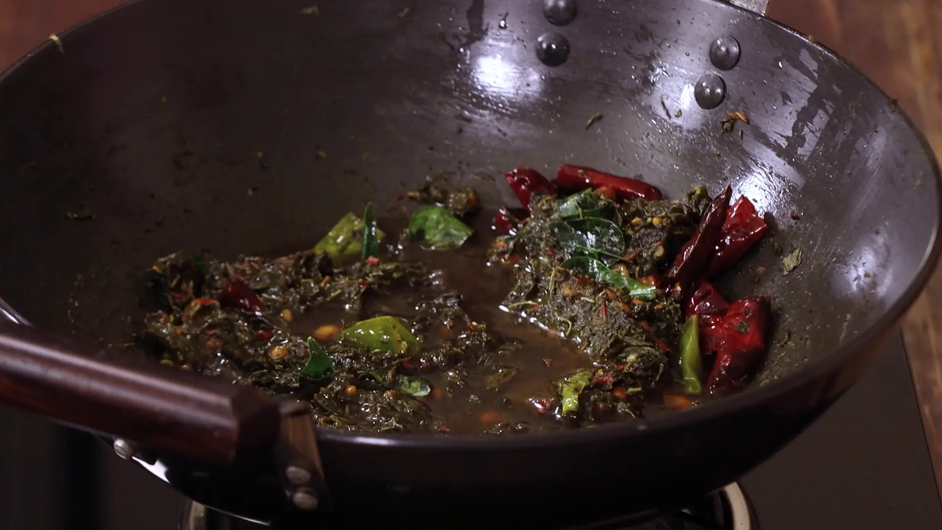 Now add the chopped gongura leaves and sauté until they collapse and become soft and slightly darker — that’s when the sourness mellows and the smell changes from raw to tangy-cooked. A splash of tamarind puree ties everything together, so add a little and then taste (gongura varies in tartness). Let the mixture reduce a bit so the flavors concentrate.