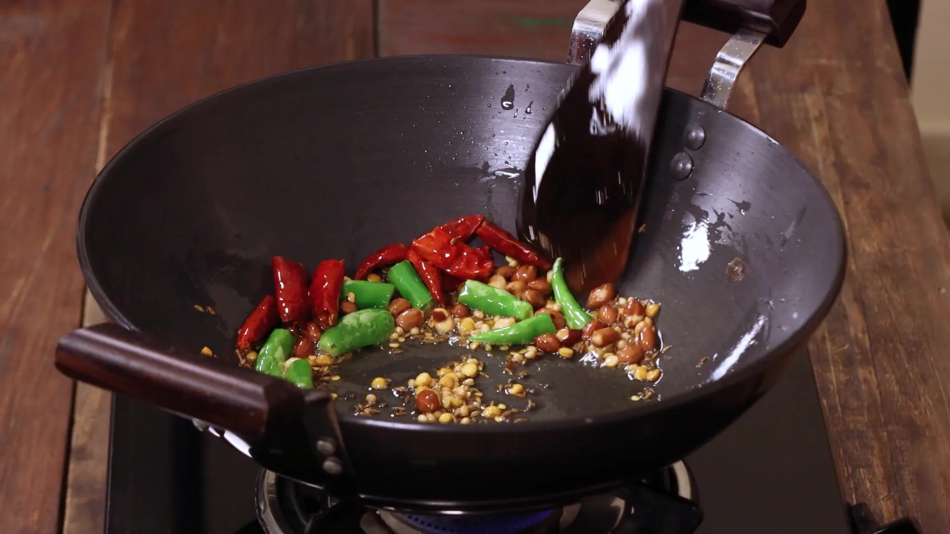 Toss in cumin seeds and mustard seeds, then add the red and green chillies for flavor. -
