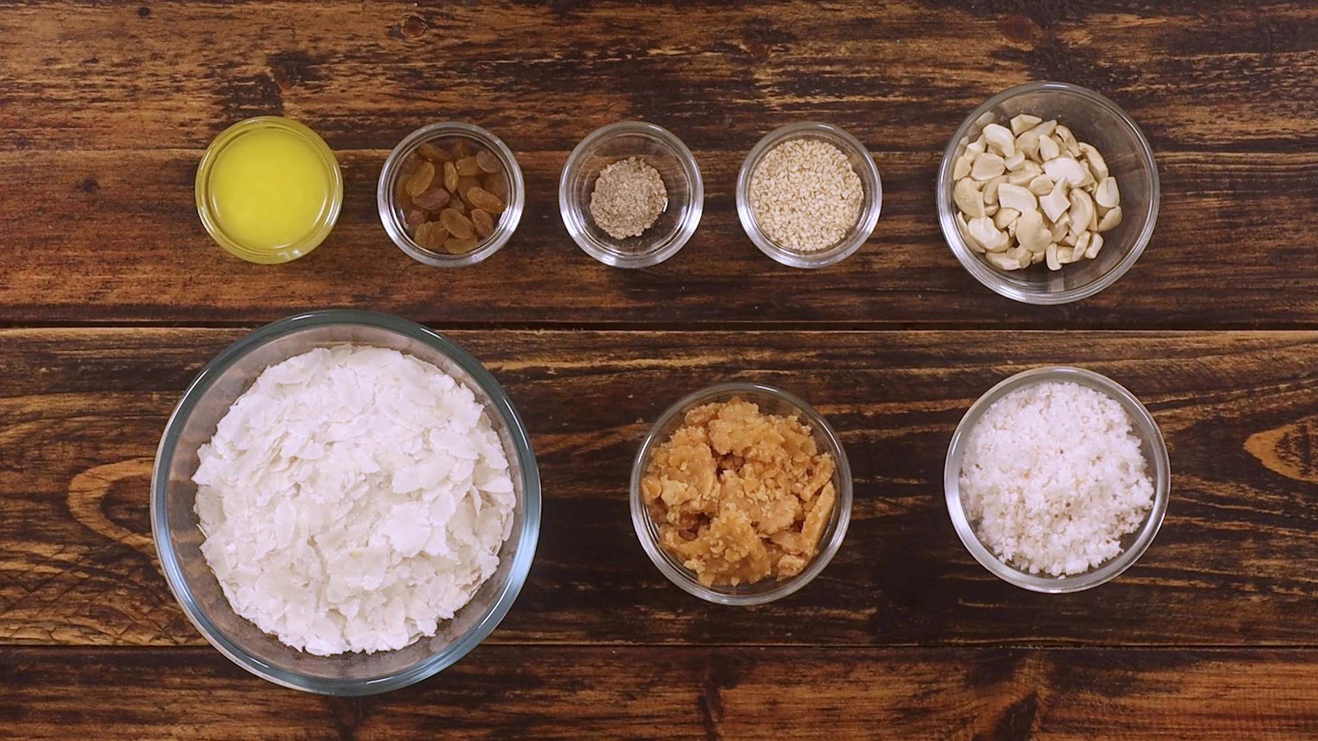 Measure jaggery, poha, sesame, raisins, cardamom and ghee and keep everything within reach. -