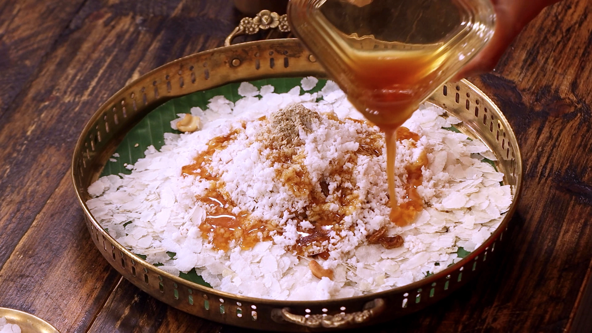 Sweet Poha — also known as Panchakajjaya in Karnataka is one of those comforting prasadams that brings instant nostalgia. Soft poha, rich jaggery, crunchy nuts, and the aroma of cardamom… this dish tastes like pure devotion!
