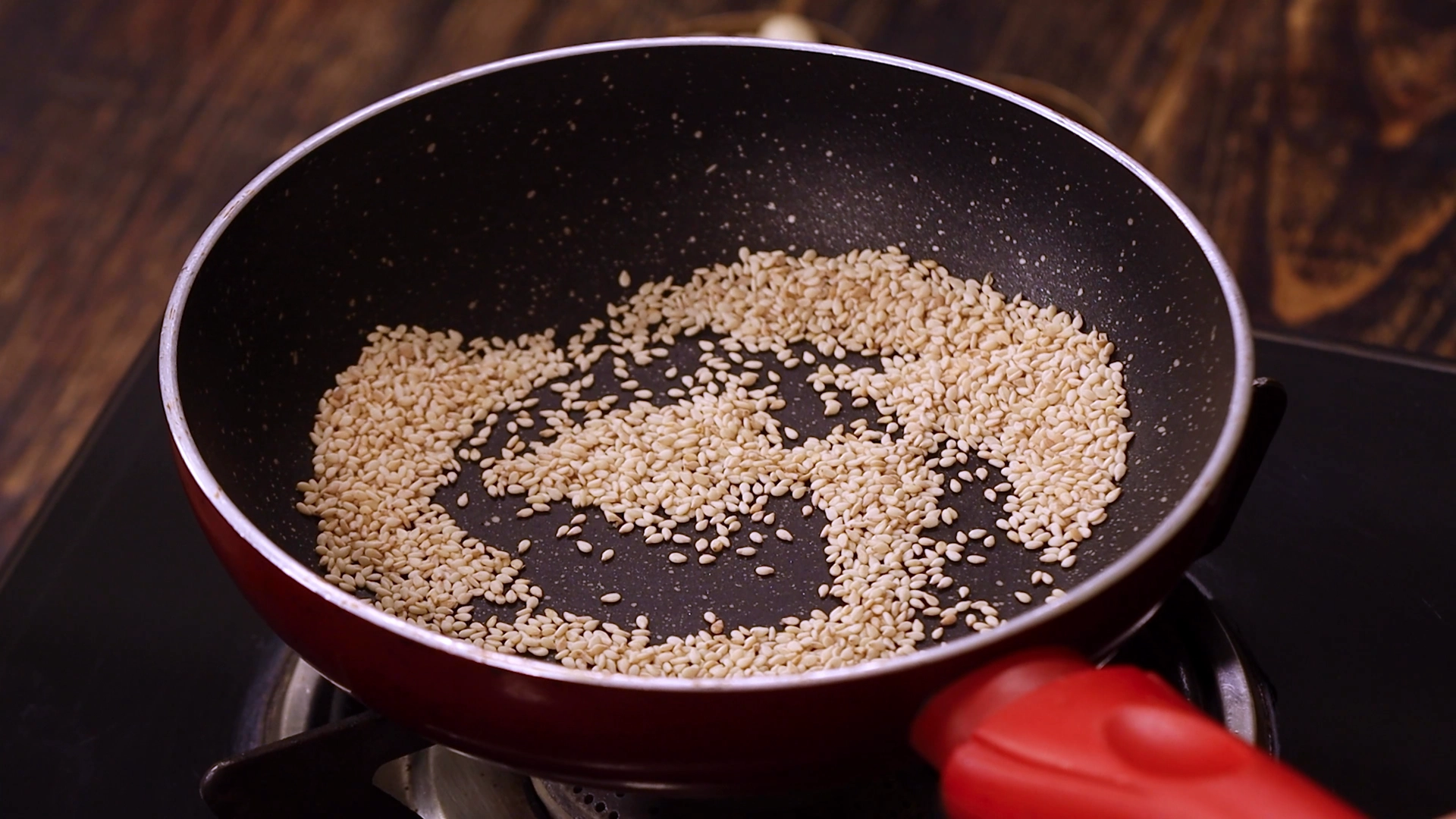 Dry-roast white sesame seeds in a pan over low flame until they turn golden and aromatic, about two to three minutes; transfer to a bowl and set aside.